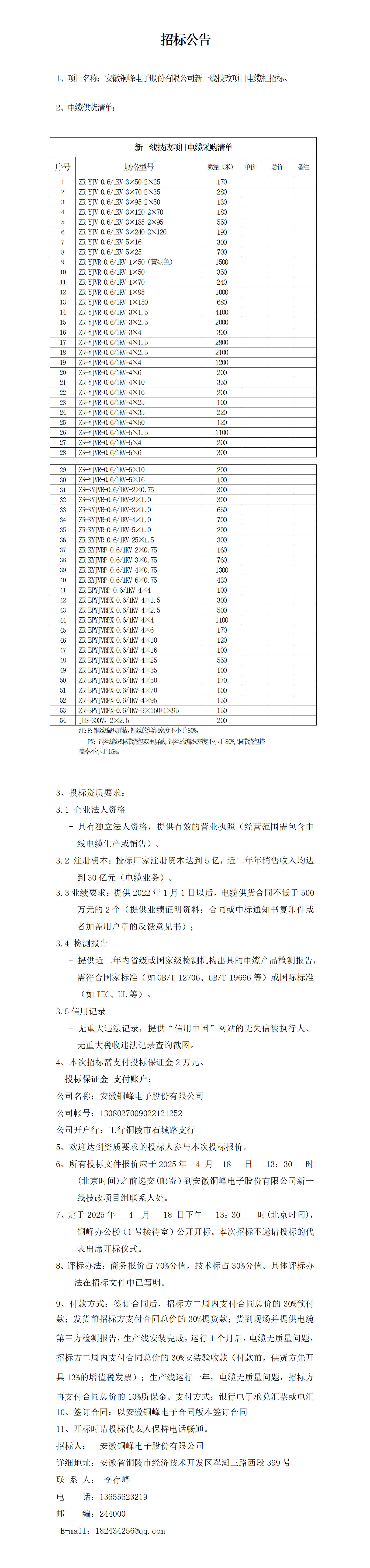 安徽銅峰電子股份有限公司新一線項目電纜招標公告_01