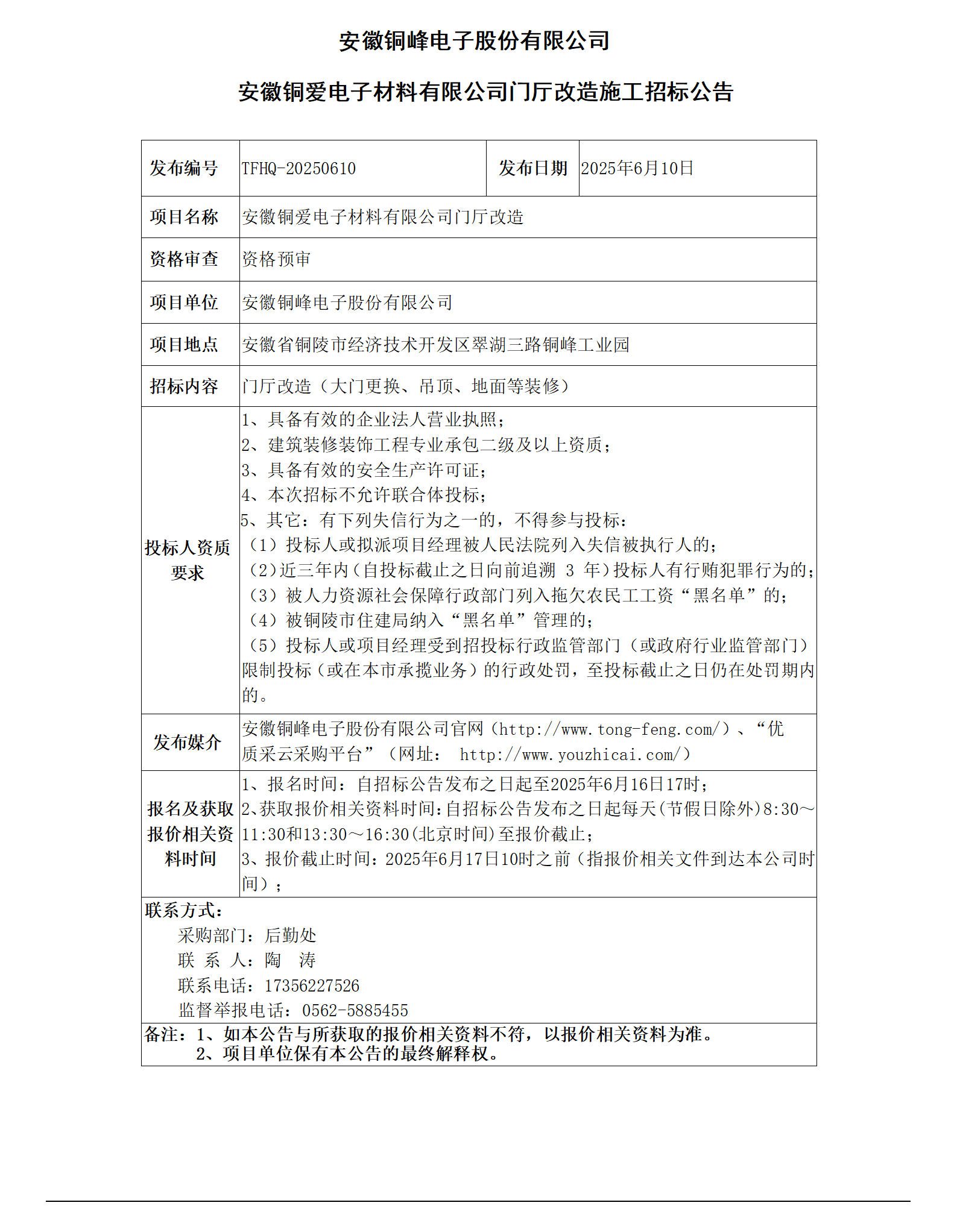 安徽銅峰電子股份有限公司 (銅愛電子公司門廳改造招標(biāo)公告)_01