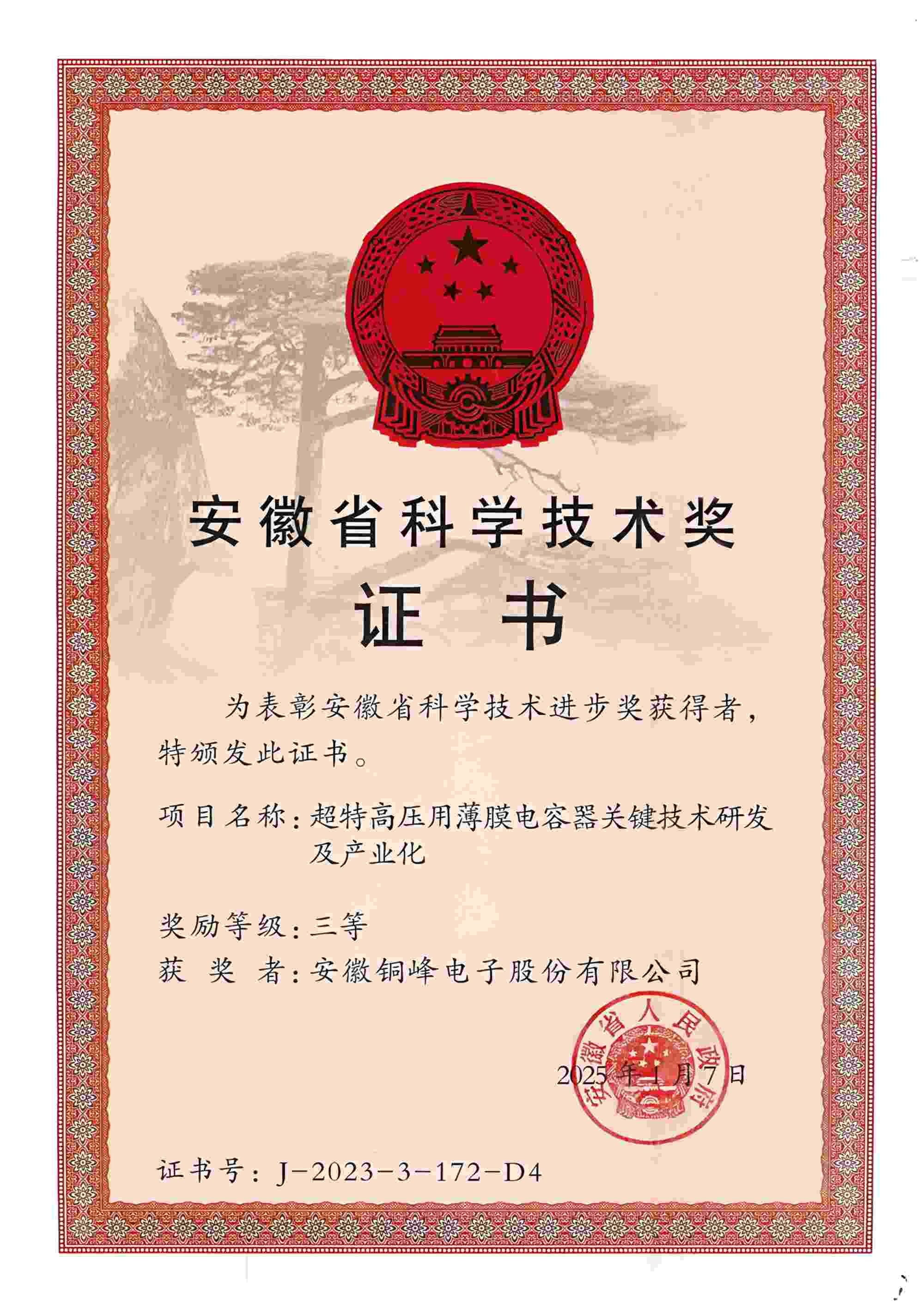 5月12日上午,安徽省科技創(chuàng)新大會召開,隆重表彰2023年度安徽省科學(xué)技術(shù)獎勵獲獎人員和組織。公司與國網(wǎng)安徽省電力有限公司、國網(wǎng)智能電網(wǎng)研究院有限公司、西安交通大學(xué)等單位聯(lián)合完成的“超特高壓用薄膜電容器關(guān)鍵技術(shù)研發(fā)及產(chǎn)業(yè)化項(xiàng)目”榮獲安徽省科技進(jìn)步三等獎。